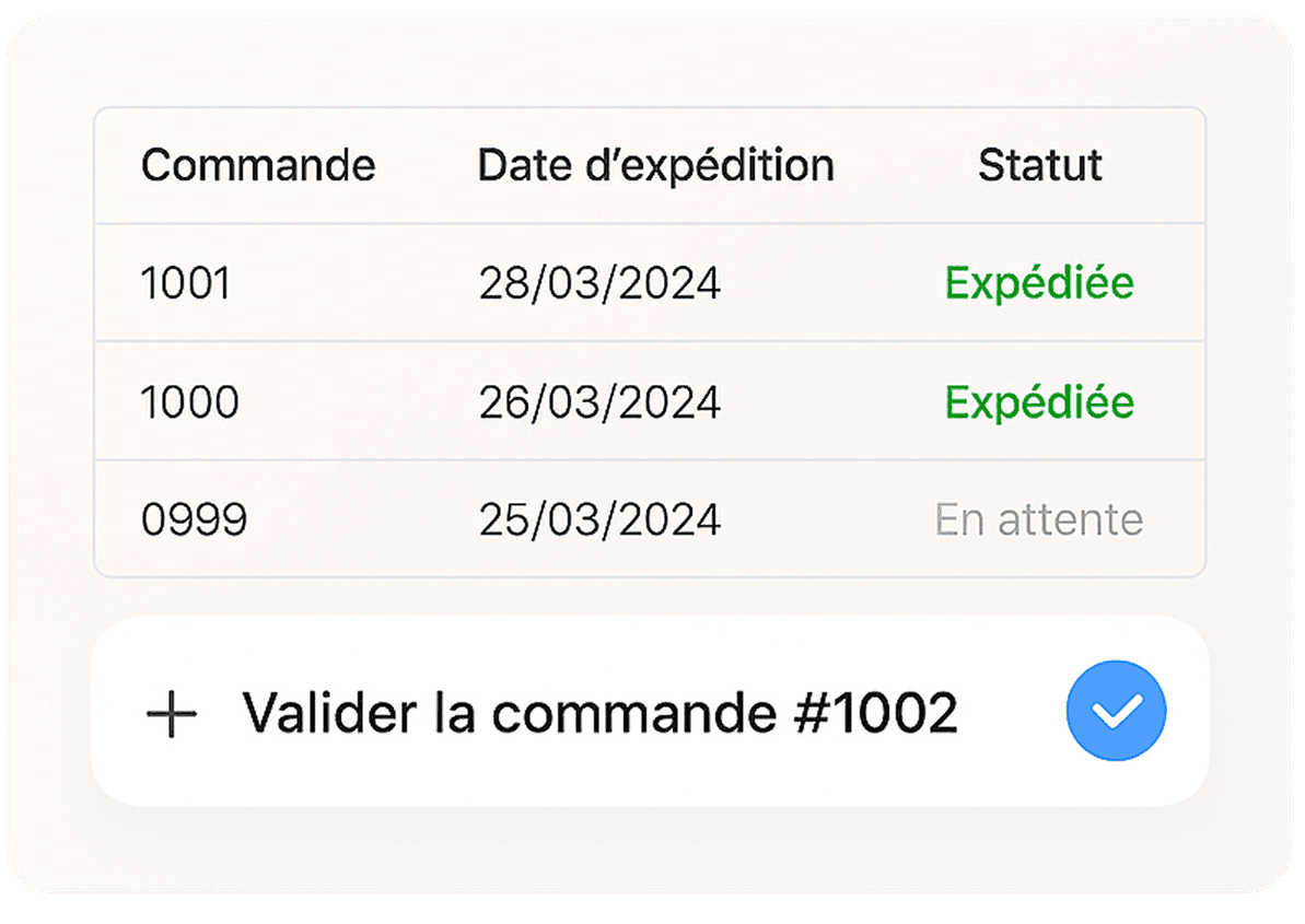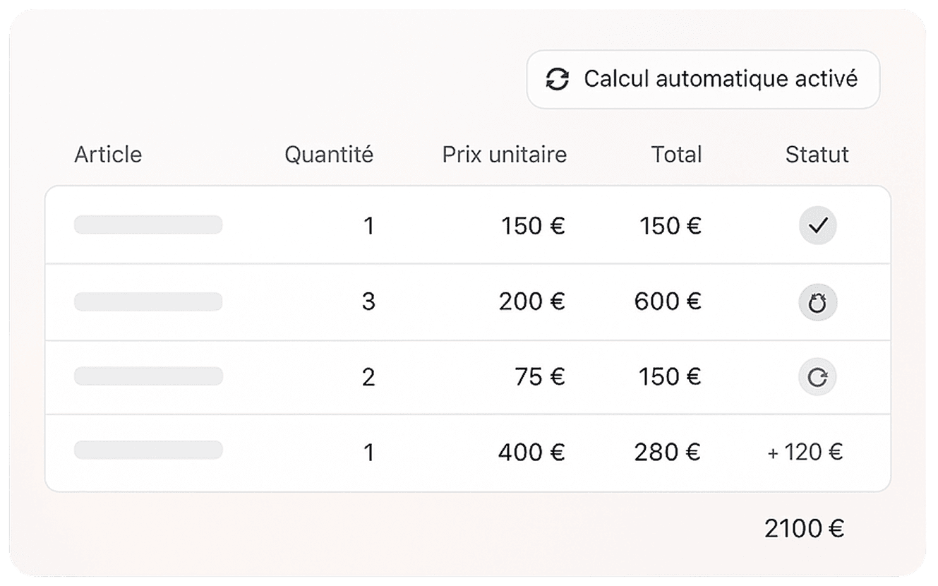 Nous calculons chaque ligne selon les événements réels de vos commandes — prolongations, pannes, avenants ou avoirs.